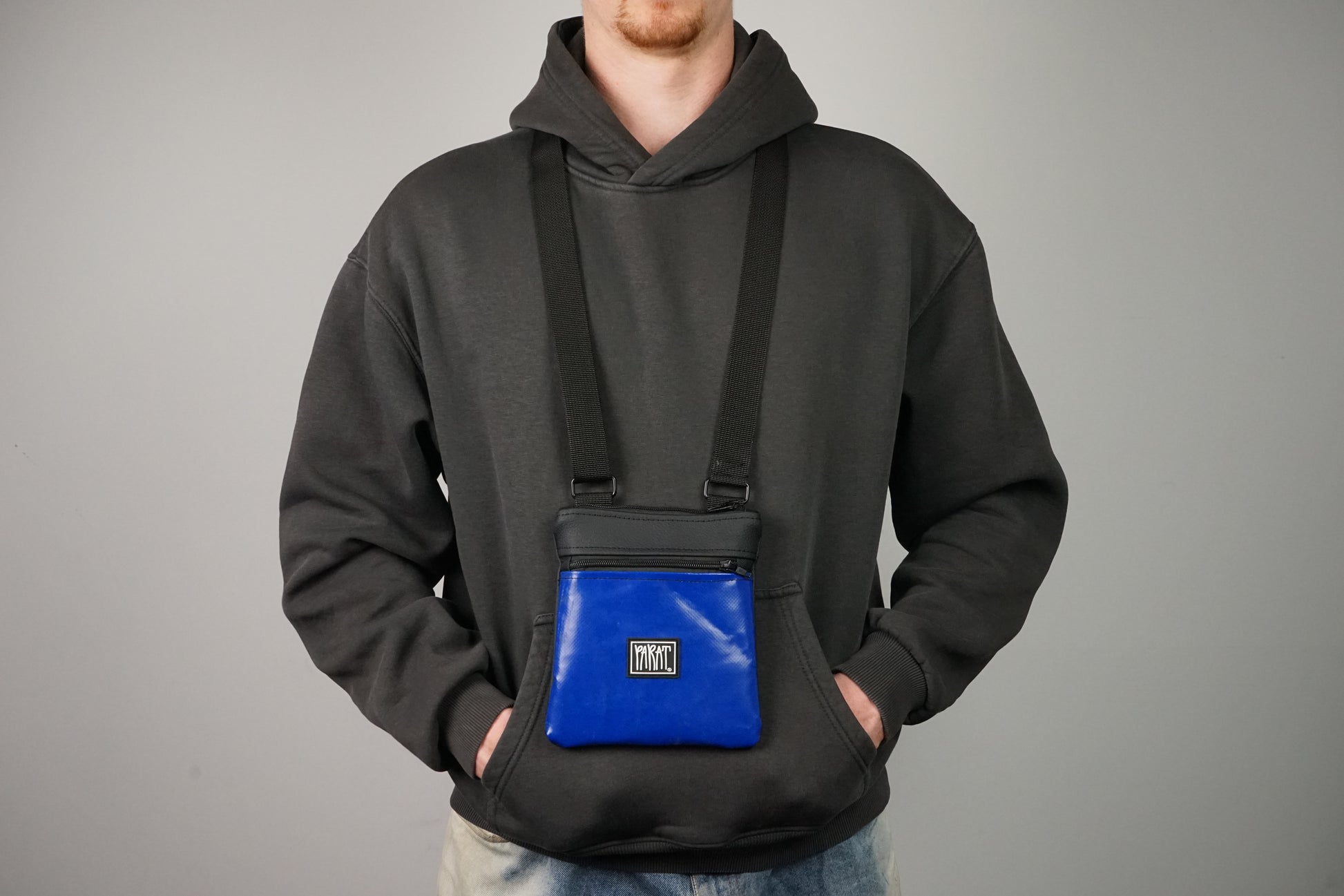 Tasche aus glänzender LKW-Plane in Tiefblau. Plane ist wetterfest, strapazierfähig und leicht zu pflegen. Mit Futter, Reißverschluss und verstellbarem Gurt.